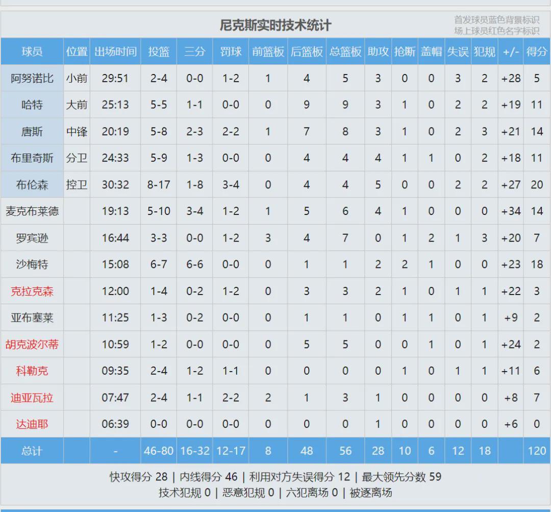 北京时间1月22日,NBA常规赛:尼克斯主场120-66狂胜篮网54分。第四节打了一半,篮网全队0分。最终篮网第四节得到10分,尼克斯第四节32分。比赛还剩1分多钟时,尼克斯120-61一度领先到59分,可惜没能守住这个分差。