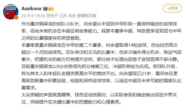 朱艺在社交媒体上写到:作为重庆铜梁龙的创队小队长,向余望从中冠到中甲阶段一直保持稳定的进球效率,但尚未有机会在中超证明自身能力。观察本赛季中超,特别是争冠军团与中甲之间的比赛强度存在明显差距。