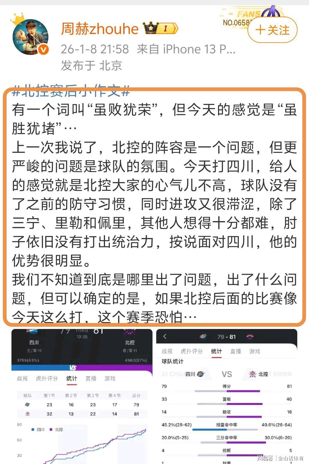 赛后,媒体人周赫zhouhe在社媒发文,点评了本场比赛。“有一个词叫“虽败犹荣”,但今天的感觉是“虽胜犹堵”…上一次我说了,北控的阵容是一个问题,但更严峻的问题是球队的氛围。今天打四川,给人的感觉就是北控大家的心气儿不高,球队没有了之前的防守习惯,同时进攻又很滞涩……按说面对四川,他的优势很明显。”。