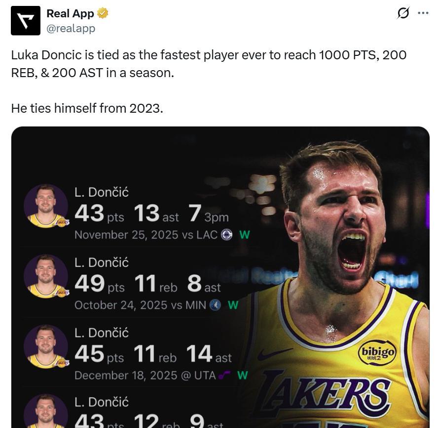即便如此,凭借全场全能表现,东契奇本赛季已经拿到超过1000分200板200助,成功追平自己在2023年创造的29场最快纪录。